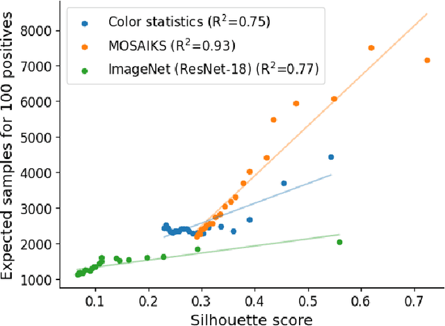 Abstract:Rare object detection is a fundamental task in applied geospatial machine learning, however is often challenging due to large amounts of high-resolution satellite or aerial imagery and few or no labeled positive samples to start with. This paper addresses the problem of bootstrapping such a rare object detection task assuming there is no labeled data and no spatial prior over the area of interest. We propose novel offline and online cluster-based approaches for sampling patches that are significantly more efficient, in terms of exposing positive samples to a human annotator, than random sampling. We apply our methods for identifying bomas, or small enclosures for herd animals, in the Serengeti Mara region of Kenya and Tanzania. We demonstrate a significant enhancement in detection efficiency, achieving a positive sampling rate increase from 2% (random) to 30%. This advancement enables effective machine learning mapping even with minimal labeling budgets, exemplified by an F1 score on the boma detection task of 0.51 with a budget of 300 total patches.