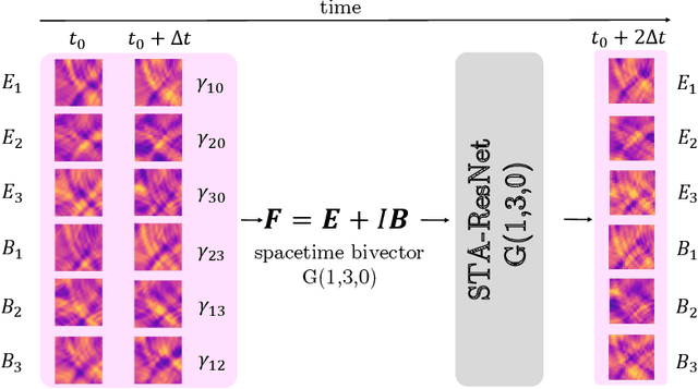 Abstract:We introduce STAResNet, a ResNet architecture in Spacetime Algebra (STA) to solve Maxwell's partial differential equations (PDEs). Recently, networks in Geometric Algebra (GA) have been demonstrated to be an asset for truly geometric machine learning. In \cite{brandstetter2022clifford}, GA networks have been employed for the first time to solve partial differential equations (PDEs), demonstrating an increased accuracy over real-valued networks. In this work we solve Maxwell's PDEs both in GA and STA employing the same ResNet architecture and dataset, to discuss the impact that the choice of the right algebra has on the accuracy of GA networks. Our study on STAResNet shows how the correct geometric embedding in Clifford Networks gives a mean square error (MSE), between ground truth and estimated fields, up to 2.6 times lower than than obtained with a standard Clifford ResNet with 6 times fewer trainable parameters. STAREsNet demonstrates consistently lower MSE and higher correlation regardless of scenario. The scenarios tested are: sampling period of the dataset; presence of obstacles with either seen or unseen configurations; the number of channels in the ResNet architecture; the number of rollout steps; whether the field is in 2D or 3D space. This demonstrates how choosing the right algebra in Clifford networks is a crucial factor for more compact, accurate, descriptive and better generalising pipelines.