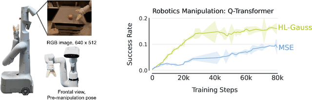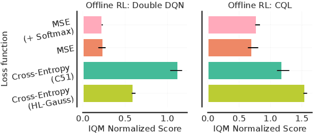 Abstract:Value functions are a central component of deep reinforcement learning (RL). These functions, parameterized by neural networks, are trained using a mean squared error regression objective to match bootstrapped target values. However, scaling value-based RL methods that use regression to large networks, such as high-capacity Transformers, has proven challenging. This difficulty is in stark contrast to supervised learning: by leveraging a cross-entropy classification loss, supervised methods have scaled reliably to massive networks. Observing this discrepancy, in this paper, we investigate whether the scalability of deep RL can also be improved simply by using classification in place of regression for training value functions. We demonstrate that value functions trained with categorical cross-entropy significantly improves performance and scalability in a variety of domains. These include: single-task RL on Atari 2600 games with SoftMoEs, multi-task RL on Atari with large-scale ResNets, robotic manipulation with Q-transformers, playing Chess without search, and a language-agent Wordle task with high-capacity Transformers, achieving state-of-the-art results on these domains. Through careful analysis, we show that the benefits of categorical cross-entropy primarily stem from its ability to mitigate issues inherent to value-based RL, such as noisy targets and non-stationarity. Overall, we argue that a simple shift to training value functions with categorical cross-entropy can yield substantial improvements in the scalability of deep RL at little-to-no cost.