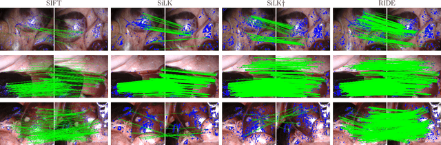 Abstract:Unlike in natural images, in endoscopy there is no clear notion of an up-right camera orientation. Endoscopic videos therefore often contain large rotational motions, which require keypoint detection and description algorithms to be robust to these conditions. While most classical methods achieve rotation-equivariant detection and invariant description by design, many learning-based approaches learn to be robust only up to a certain degree. At the same time learning-based methods under moderate rotations often outperform classical approaches. In order to address this shortcoming, in this paper we propose RIDE, a learning-based method for rotation-equivariant detection and invariant description. Following recent advancements in group-equivariant learning, RIDE models rotation-equivariance implicitly within its architecture. Trained in a self-supervised manner on a large curation of endoscopic images, RIDE requires no manual labeling of training data. We test RIDE in the context of surgical tissue tracking on the SuPeR dataset as well as in the context of relative pose estimation on a repurposed version of the SCARED dataset. In addition we perform explicit studies showing its robustness to large rotations. Our comparison against recent learning-based and classical approaches shows that RIDE sets a new state-of-the-art performance on matching and relative pose estimation tasks and scores competitively on surgical tissue tracking.