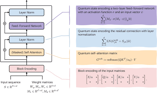 Abstract:Generative machine learning methods such as large-language models are revolutionizing the creation of text and images. While these models are powerful they also harness a large amount of computational resources. The transformer is a key component in large language models that aims to generate a suitable completion of a given partial sequence. In this work, we investigate transformer architectures under the lens of fault-tolerant quantum computing. The input model is one where pre-trained weight matrices are given as block encodings to construct the query, key, and value matrices for the transformer. As a first step, we show how to prepare a block encoding of the self-attention matrix, with a row-wise application of the softmax function using the Hadamard product. In addition, we combine quantum subroutines to construct important building blocks in the transformer, the residual connection, layer normalization, and the feed-forward neural network. Our subroutines prepare an amplitude encoding of the transformer output, which can be measured to obtain a prediction. We discuss the potential and challenges for obtaining a quantum advantage.