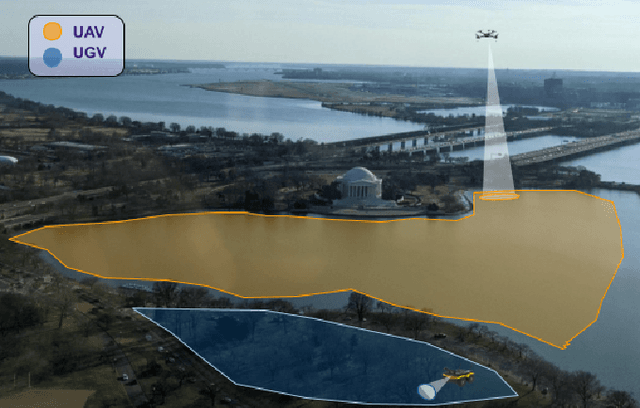 Abstract:In this paper, we present an approach for coverage path planning for a team of an energy-constrained Unmanned Aerial Vehicle (UAV) and an Unmanned Ground Vehicle (UGV). Both the UAV and the UGV have predefined areas that they have to cover. The goal is to perform complete coverage by both robots while minimizing the coverage time. The UGV can also serve as a mobile recharging station. The UAV and UGV need to occasionally rendezvous for recharging. We propose a heuristic method to address this NP-Hard planning problem. Our approach involves initially determining coverage paths without factoring in energy constraints. Subsequently, we cluster segments of these paths and employ graph matching to assign UAV clusters to UGV clusters for efficient recharging management. We perform numerical analysis on real-world coverage applications and show that compared with a greedy approach our method reduces rendezvous overhead on average by 11.33\%. We demonstrate proof-of-concept with a team of a VOXL m500 drone and a Clearpath Jackal ground vehicle, providing a complete system from the offline algorithm to the field execution.