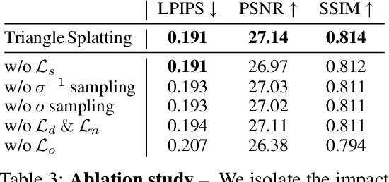 Abstract:The field of computer graphics was revolutionized by models such as Neural Radiance Fields and 3D Gaussian Splatting, displacing triangles as the dominant representation for photogrammetry. In this paper, we argue for a triangle comeback. We develop a differentiable renderer that directly optimizes triangles via end-to-end gradients. We achieve this by rendering each triangle as differentiable splats, combining the efficiency of triangles with the adaptive density of representations based on independent primitives. Compared to popular 2D and 3D Gaussian Splatting methods, our approach achieves higher visual fidelity, faster convergence, and increased rendering throughput. On the Mip-NeRF360 dataset, our method outperforms concurrent non-volumetric primitives in visual fidelity and achieves higher perceptual quality than the state-of-the-art Zip-NeRF on indoor scenes. Triangles are simple, compatible with standard graphics stacks and GPU hardware, and highly efficient: for the \textit{Garden} scene, we achieve over 2,400 FPS at 1280x720 resolution using an off-the-shelf mesh renderer. These results highlight the efficiency and effectiveness of triangle-based representations for high-quality novel view synthesis. Triangles bring us closer to mesh-based optimization by combining classical computer graphics with modern differentiable rendering frameworks. The project page is https://trianglesplatting.github.io/