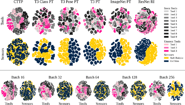 Abstract:Today's tactile sensors have a variety of different designs, making it challenging to develop general-purpose methods for processing touch signals. In this paper, we learn a unified representation that captures the shared information between different tactile sensors. Unlike current approaches that focus on reconstruction or task-specific supervision, we leverage contrastive learning to integrate tactile signals from two different sensors into a shared embedding space, using a dataset in which the same objects are probed with multiple sensors. We apply this approach to paired touch signals from GelSlim and Soft Bubble sensors. We show that our learned features provide strong pretraining for downstream pose estimation and classification tasks. We also show that our embedding enables models trained using one touch sensor to be deployed using another without additional training. Project details can be found at https://www.mmintlab.com/research/cttp/.