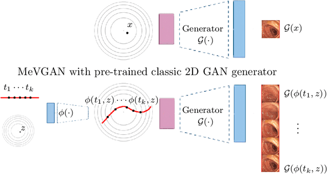 Abstract:Video generation is important, especially in medicine, as much data is given in this form. However, video generation of high-resolution data is a very demanding task for generative models, due to the large need for memory. In this paper, we propose Memory Efficient Video GAN (MeVGAN) - a Generative Adversarial Network (GAN) which uses plugin-type architecture. We use a pre-trained 2D-image GAN and only add a simple neural network to construct respective trajectories in the noise space, so that the trajectory forwarded through the GAN model constructs a real-life video. We apply MeVGAN in the task of generating colonoscopy videos. Colonoscopy is an important medical procedure, especially beneficial in screening and managing colorectal cancer. However, because colonoscopy is difficult and time-consuming to learn, colonoscopy simulators are widely used in educating young colonoscopists. We show that MeVGAN can produce good quality synthetic colonoscopy videos, which can be potentially used in virtual simulators.