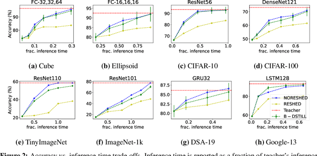 Abstract:We study the problem of progressive distillation: Given a large, pre-trained teacher model $g$, we seek to decompose the model into an ensemble of smaller, low-inference cost student models $f_i$. The resulting ensemble allows for flexibly tuning accuracy vs. inference cost, which is useful for a number of applications in on-device inference. The method we propose, B-DISTIL, relies on an algorithmic procedure that uses function composition over intermediate activations to construct expressive ensembles with similar performance as $g$, but with much smaller student models. We demonstrate the effectiveness of \algA by decomposing pretrained models across standard image, speech, and sensor datasets. We also provide theoretical guarantees for our method in terms of convergence and generalization.