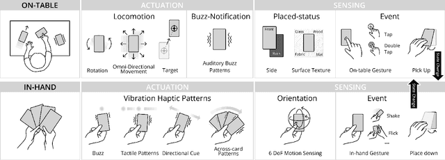 Abstract:This paper introduces a novel approach to interactive robots by leveraging the form-factor of cards to create thin robots equipped with vibrational capabilities for locomotion and haptic feedback. The system is composed of flat-shaped robots with on-device sensing and wireless control, which offer lightweight portability and scalability. This research introduces a hardware prototype. Applications include augmented card playing, educational tools, and assistive technology, which showcase CARDinality's versatility in tangible interaction.