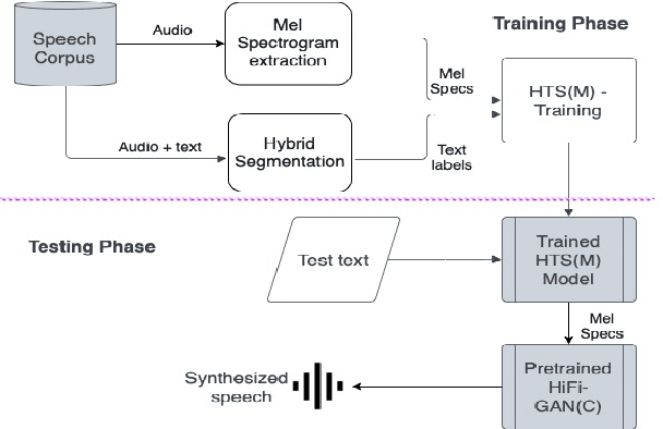 Abstract:Hidden-Markov-model (HMM) based text-to-speech (HTS) offers flexibility in speaking styles along with fast training and synthesis while being computationally less intense. HTS performs well even in low-resource scenarios. The primary drawback is that the voice quality is poor compared to that of E2E systems. A hybrid approach combining HMM-based feature generation and neural-network-based HiFi-GAN vocoder to improve HTS synthesis quality is proposed. HTS is trained on high-resolution mel-spectrograms instead of conventional mel generalized coefficients (MGC), and the output mel-spectrogram corresponding to the input text is used in a HiFi-GAN vocoder trained on Indic languages, to produce naturalness that is equivalent to that of E2E systems, as evidenced from the DMOS and PC tests.