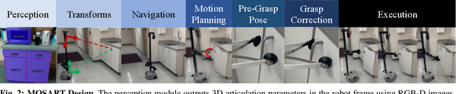 Abstract:Pulling open cabinets and drawers presents many difficult technical challenges in perception (inferring articulation parameters for objects from onboard sensors), planning (producing motion plans that conform to tight task constraints), and control (making and maintaining contact while applying forces on the environment). In this work, we build an end-to-end system that enables a commodity mobile manipulator (Stretch RE2) to pull open cabinets and drawers in diverse previously unseen real world environments. We conduct 4 days of real world testing of this system spanning 31 different objects from across 13 different real world environments. Our system achieves a success rate of 61% on opening novel cabinets and drawers in unseen environments zero-shot. An analysis of the failure modes suggests that errors in perception are the most significant challenge for our system. We will open source code and models for others to replicate and build upon our system.