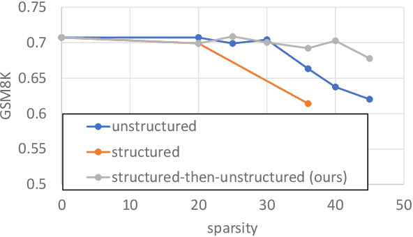 Abstract:Mixture-of-experts (MoEs) have been adopted for reducing inference costs by sparsely activating experts in Large language models (LLMs). Despite this reduction, the massive number of experts in MoEs still makes them expensive to serve. In this paper, we study how to address this, by pruning MoEs. Among pruning methodologies, unstructured pruning has been known to achieve the highest performance for a given pruning ratio, compared to structured pruning, since the latter imposes constraints on the sparsification structure. This is intuitive, as the solution space of unstructured pruning subsumes that of structured pruning. However, our counterintuitive finding reveals that expert pruning, a form of structured pruning, can actually precede unstructured pruning to outperform unstructured-only pruning. As existing expert pruning, requiring $O(\frac{k^n}{\sqrt{n}})$ forward passes for $n$ experts, cannot scale for recent MoEs, we propose a scalable alternative with $O(1)$ complexity, yet outperforming the more expensive methods. The key idea is leveraging a latent structure between experts, based on behavior similarity, such that the greedy decision of whether to prune closely captures the joint pruning effect. Ours is highly effective -- for Snowflake Arctic, a 480B-sized MoE with 128 experts, our method needs only one H100 and two hours to achieve nearly no loss in performance with 40% sparsity, even in generative tasks such as GSM8K, where state-of-the-art unstructured pruning fails to. The code will be made publicly available.