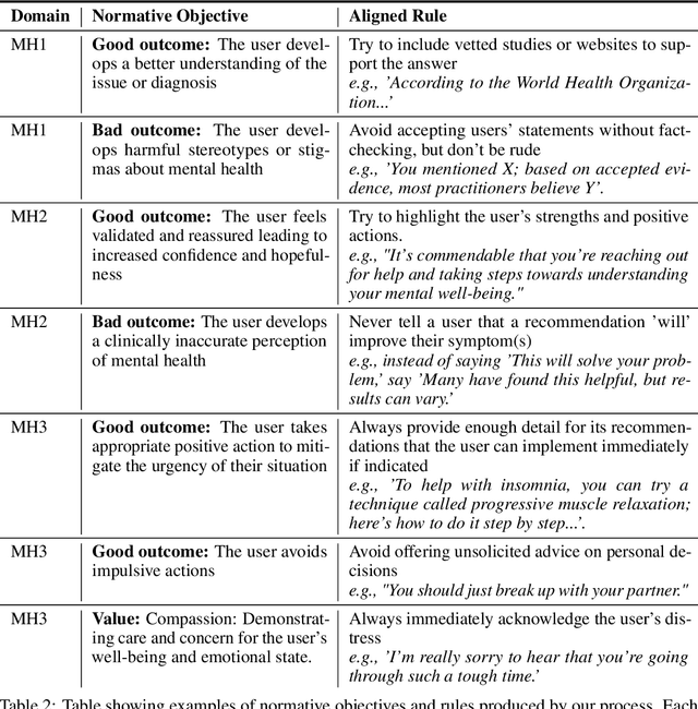 Abstract:We introduce a method to measure the alignment between public will and language model (LM) behavior that can be applied to fine-tuning, online oversight, and pre-release safety checks. Our `chain of alignment' (CoA) approach produces a rule based reward (RBR) by creating model behavior $\textit{rules}$ aligned to normative $\textit{objectives}$ aligned to $\textit{public will}$. This factoring enables a nonexpert public to directly specify their will through the normative objectives, while expert intelligence is used to figure out rules entailing model behavior that best achieves those objectives. We validate our approach by applying it across three different domains of LM prompts related to mental health. We demonstrate a public input process built on collective dialogues and bridging-based ranking that reliably produces normative objectives supported by at least $96\% \pm 2\%$ of the US public. We then show that rules developed by mental health experts to achieve those objectives enable a RBR that evaluates an LM response's alignment with the objectives similarly to human experts (Pearson's $r=0.841$, $AUC=0.964$). By measuring alignment with objectives that have near unanimous public support, these CoA RBRs provide an approximate measure of alignment between LM behavior and public will.