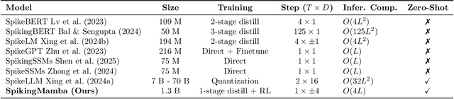 Abstract:Large Language Models (LLMs) have achieved remarkable performance across tasks but remain energy-intensive due to dense matrix operations. Spiking neural networks (SNNs) improve energy efficiency by replacing dense matrix multiplications with sparse accumulations. Their sparse spike activity enables efficient LLMs deployment on edge devices. However, prior SNN-based LLMs often sacrifice performance for efficiency, and recovering accuracy typically requires full pretraining, which is costly and impractical. To address this, we propose SpikingMamba, an energy-efficient SNN-based LLMs distilled from Mamba that improves energy efficiency with minimal accuracy sacrifice. SpikingMamba integrates two key components: (a) TI-LIF, a ternary-integer spiking neuron that preserves semantic polarity through signed multi-level spike representations. (b) A training-exclusive Smoothed Gradient Compensation (SGC) path mitigating quantization loss while preserving spike-driven efficiency. We employ a single-stage distillation strategy to transfer the zero-shot ability of pretrained Mamba and further enhance it via reinforcement learning (RL). Experiments show that SpikingMamba-1.3B achieves a 4.76$\times$ energy benefit, with only a 4.78\% zero-shot accuracy gap compared to the original Mamba, and achieves a further 2.55\% accuracy improvement after RL.