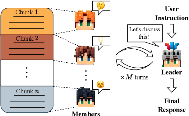 Abstract:Large language models (LLMs) have demonstrated impressive performance in understanding language and executing complex reasoning tasks. However, LLMs with long context windows have been notorious for their expensive training costs and high inference latency. Even the most advanced models such as GPT-4 and Claude2 often make mistakes when processing inputs of over $100k$ tokens, a phenomenon also known as \textit{lost in the middle}. In this paper, we propose \textsc{LongAgent}, a method based on multi-agent collaboration, which scales LLMs (e.g., LLaMA) to a context of 128K and demonstrates potential superiority in long-text processing compared to GPT-4. In \textsc{LongAgent}, a leader is responsible for understanding user intent and directing team members to acquire information from documents. Due to members' hallucinations, it is non-trivial for a leader to obtain accurate information from the responses of dozens to hundreds of members. To address this, we develop an \textit{inter-member communication} mechanism to resolve response conflicts caused by hallucinations through information sharing. Our experimental results indicate that \textsc{LongAgent} offers a promising alternative for long-text processing. The agent team instantiated with LLaMA-7B achieves significant improvements in tasks such as 128k-long text retrieval, multi-hop question answering, compared to GPT-4.