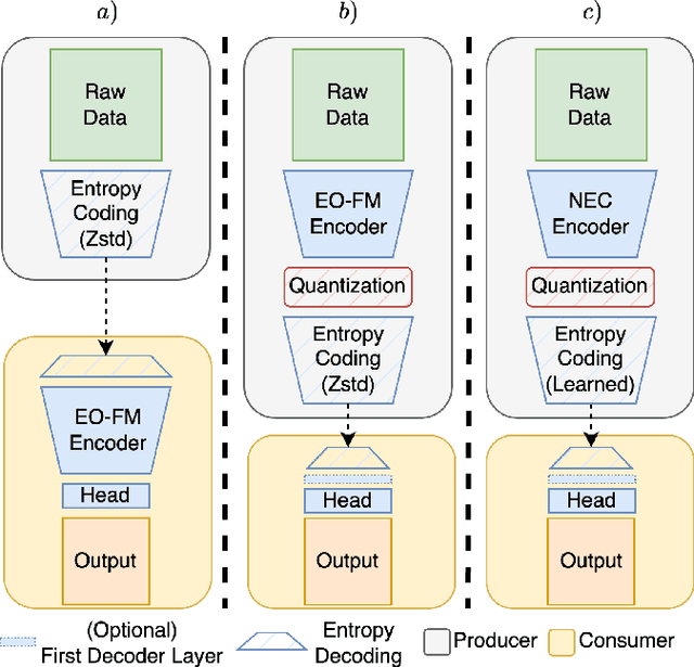 Abstract:As repositories of large scale data in earth observation (EO) have grown, so have transfer and storage costs for model training and inference, expending significant resources. We introduce Neural Embedding Compression (NEC), based on the transfer of compressed embeddings to data consumers instead of raw data. We adapt foundation models (FM) through learned neural compression to generate multi-task embeddings while navigating the tradeoff between compression rate and embedding utility. We update only a small fraction of the FM parameters (10%) for a short training period (1% of the iterations of pre-training). We evaluate NEC on two EO tasks: scene classification and semantic segmentation. Compared with applying traditional compression to the raw data, NEC achieves similar accuracy with a 75% to 90% reduction in data. Even at 99.7% compression, performance drops by only 5% on the scene classification task. Overall, NEC is a data-efficient yet performant approach for multi-task EO modelling.