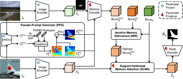 Abstract:Few-Shot Segmentation (FSS) aims to learn class-agnostic segmentation on few classes to segment arbitrary classes, but at the risk of overfitting. To address this, some methods use the well-learned knowledge of foundation models (e.g., SAM) to simplify the learning process. Recently, SAM 2 has extended SAM by supporting video segmentation, whose class-agnostic matching ability is useful to FSS. A simple idea is to encode support foreground (FG) features as memory, with which query FG features are matched and fused. Unfortunately, the FG objects in different frames of SAM 2's video data are always the same identity, while those in FSS are different identities, i.e., the matching step is incompatible. Therefore, we design Pseudo Prompt Generator to encode pseudo query memory, matching with query features in a compatible way. However, the memories can never be as accurate as the real ones, i.e., they are likely to contain incomplete query FG, and some unexpected query background (BG) features, leading to wrong segmentation. Hence, we further design Iterative Memory Refinement to fuse more query FG features into the memory, and devise a Support-Calibrated Memory Attention to suppress the unexpected query BG features in memory. Extensive experiments have been conducted on PASCAL-5$^i$ and COCO-20$^i$ to validate the effectiveness of our design, e.g., the 1-shot mIoU can be 4.2% better than the best baseline.