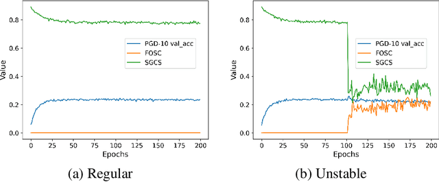 Abstract:This paper examines the phenomenon of probabilistic robustness overestimation in TRADES, a prominent adversarial training method. Our study reveals that TRADES sometimes yields disproportionately high PGD validation accuracy compared to the AutoAttack testing accuracy in the multiclass classification task. This discrepancy highlights a significant overestimation of robustness for these instances, potentially linked to gradient masking. We further analyze the parameters contributing to unstable models that lead to overestimation. Our findings indicate that smaller batch sizes, lower beta values (which control the weight of the robust loss term in TRADES), larger learning rates, and higher class complexity (e.g., CIFAR-100 versus CIFAR-10) are associated with an increased likelihood of robustness overestimation. By examining metrics such as the First-Order Stationary Condition (FOSC), inner-maximization, and gradient information, we identify the underlying cause of this phenomenon as gradient masking and provide insights into it. Furthermore, our experiments show that certain unstable training instances may return to a state without robust overestimation, inspiring our attempts at a solution. In addition to adjusting parameter settings to reduce instability or retraining when overestimation occurs, we recommend incorporating Gaussian noise in inputs when the FOSC score exceed the threshold. This method aims to mitigate robustness overestimation of TRADES and other similar methods at its source, ensuring more reliable representation of adversarial robustness during evaluation.