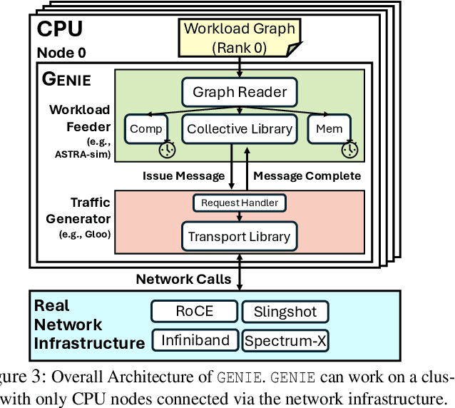 Abstract:This paper lays the foundation for Genie, a testing framework that captures the impact of real hardware network behavior on ML workload performance, without requiring expensive GPUs. Genie uses CPU-initiated traffic over a hardware testbed to emulate GPU to GPU communication, and adapts the ASTRA-sim simulator to model interaction between the network and the ML workload.