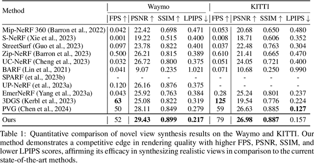 Abstract:3D Gaussian Splatting (3DGS) has become a popular solution in SLAM, as it can produce high-fidelity novel views. However, previous GS-based methods primarily target indoor scenes and rely on RGB-D sensors or pre-trained depth estimation models, hence underperforming in outdoor scenarios. To address this issue, we propose a RGB-only gaussian splatting SLAM method for unbounded outdoor scenes--OpenGS-SLAM. Technically, we first employ a pointmap regression network to generate consistent pointmaps between frames for pose estimation. Compared to commonly used depth maps, pointmaps include spatial relationships and scene geometry across multiple views, enabling robust camera pose estimation. Then, we propose integrating the estimated camera poses with 3DGS rendering as an end-to-end differentiable pipeline. Our method achieves simultaneous optimization of camera poses and 3DGS scene parameters, significantly enhancing system tracking accuracy. Specifically, we also design an adaptive scale mapper for the pointmap regression network, which provides more accurate pointmap mapping to the 3DGS map representation. Our experiments on the Waymo dataset demonstrate that OpenGS-SLAM reduces tracking error to 9.8\% of previous 3DGS methods, and achieves state-of-the-art results in novel view synthesis. Project Page: https://3dagentworld.github.io/opengs-slam/