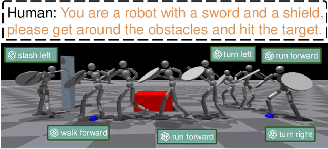 Abstract:In recent years, reinforcement learning and imitation learning have shown great potential for controlling humanoid robots' motion. However, these methods typically create simulation environments and rewards for specific tasks, resulting in the requirements of multiple policies and limited capabilities for tackling complex and unknown tasks. To overcome these issues, we present a novel approach that combines adversarial imitation learning with large language models (LLMs). This innovative method enables the agent to learn reusable skills with a single policy and solve zero-shot tasks under the guidance of LLMs. In particular, we utilize the LLM as a strategic planner for applying previously learned skills to novel tasks through the comprehension of task-specific prompts. This empowers the robot to perform the specified actions in a sequence. To improve our model, we incorporate codebook-based vector quantization, allowing the agent to generate suitable actions in response to unseen textual commands from LLMs. Furthermore, we design general reward functions that consider the distinct motion features of humanoid robots, ensuring the agent imitates the motion data while maintaining goal orientation without additional guiding direction approaches or policies. To the best of our knowledge, this is the first framework that controls humanoid robots using a single learning policy network and LLM as a planner. Extensive experiments demonstrate that our method exhibits efficient and adaptive ability in complicated motion tasks.
