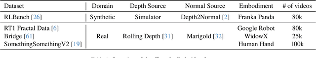Abstract:This paper presents an effective approach for learning novel 4D embodied world models, which predict the dynamic evolution of 3D scenes over time in response to an embodied agent's actions, providing both spatial and temporal consistency. We propose to learn a 4D world model by training on RGB-DN (RGB, Depth, and Normal) videos. This not only surpasses traditional 2D models by incorporating detailed shape, configuration, and temporal changes into their predictions, but also allows us to effectively learn accurate inverse dynamic models for an embodied agent. Specifically, we first extend existing robotic manipulation video datasets with depth and normal information leveraging off-the-shelf models. Next, we fine-tune a video generation model on this annotated dataset, which jointly predicts RGB-DN (RGB, Depth, and Normal) for each frame. We then present an algorithm to directly convert generated RGB, Depth, and Normal videos into a high-quality 4D scene of the world. Our method ensures temporal and spatial coherence in 4D scene predictions from embodied scenarios, enables novel view synthesis for embodied environments, and facilitates policy learning that significantly outperforms those derived from prior video-based world models.
