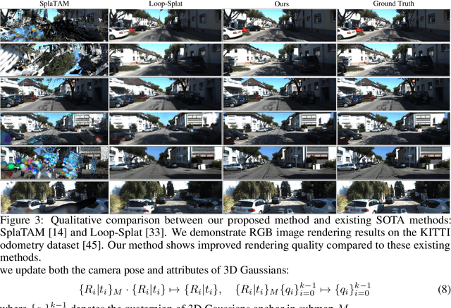 Abstract:3D Gaussian Splatting has recently shown promising results in dense visual SLAM. However, existing 3DGS-based SLAM methods are all constrained to small-room scenarios and struggle with memory explosion in large-scale scenes and long sequences. To this end, we propose VPGS-SLAM, the first 3DGS-based large-scale RGBD SLAM framework for both indoor and outdoor scenarios. We design a novel voxel-based progressive 3D Gaussian mapping method with multiple submaps for compact and accurate scene representation in large-scale and long-sequence scenes. This allows us to scale up to arbitrary scenes and improves robustness (even under pose drifts). In addition, we propose a 2D-3D fusion camera tracking method to achieve robust and accurate camera tracking in both indoor and outdoor large-scale scenes. Furthermore, we design a 2D-3D Gaussian loop closure method to eliminate pose drift. We further propose a submap fusion method with online distillation to achieve global consistency in large-scale scenes when detecting a loop. Experiments on various indoor and outdoor datasets demonstrate the superiority and generalizability of the proposed framework. The code will be open source on https://github.com/dtc111111/vpgs-slam.