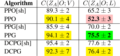 Abstract:Extracting relevant information from a stream of high-dimensional observations is a central challenge for deep reinforcement learning agents. Actor-critic algorithms add further complexity to this challenge, as it is often unclear whether the same information will be relevant to both the actor and the critic. To this end, we here explore the principles that underlie effective representations for the actor and for the critic in on-policy algorithms. We focus our study on understanding whether the actor and critic will benefit from separate, rather than shared, representations. Our primary finding is that when separated, the representations for the actor and critic systematically specialise in extracting different types of information from the environment -- the actor's representation tends to focus on action-relevant information, while the critic's representation specialises in encoding value and dynamics information. We conduct a rigourous empirical study to understand how different representation learning approaches affect the actor and critic's specialisations and their downstream performance, in terms of sample efficiency and generation capabilities. Finally, we discover that a separated critic plays an important role in exploration and data collection during training. Our code, trained models and data are accessible at https://github.com/francelico/deac-rep.