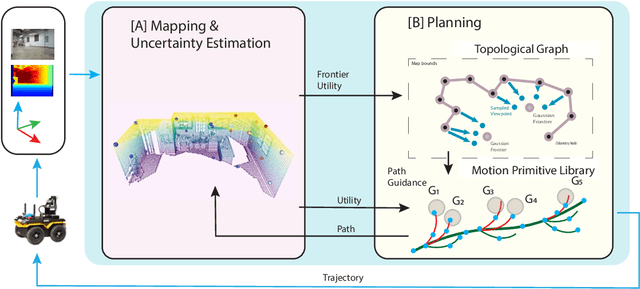 Abstract:We propose a framework for active mapping and exploration that leverages Gaussian splatting for constructing information-rich maps. Further, we develop a parallelized motion planning algorithm that can exploit the Gaussian map for real-time navigation. The Gaussian map constructed onboard the robot is optimized for both photometric and geometric quality while enabling real-time situational awareness for autonomy. We show through simulation experiments that our method is competitive with approaches that use alternate information gain metrics, while being orders of magnitude faster to compute. In real-world experiments, our algorithm achieves better map quality (10% higher Peak Signal-to-Noise Ratio (PSNR) and 30% higher geometric reconstruction accuracy) than Gaussian maps constructed by traditional exploration baselines. Experiment videos and more details can be found on our project page: https://tyuezhan.github.io/RT_GuIDE/