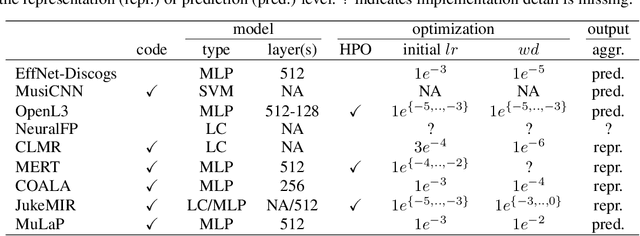 Abstract:In this work, we address music representation learning using convolution-free transformers. We build on top of existing spectrogram-based audio transformers such as AST and train our models on a supervised task using patchout training similar to PaSST. In contrast to previous works, we study how specific design decisions affect downstream music tagging tasks instead of focusing on the training task. We assess the impact of initializing the models with different pre-trained weights, using various input audio segment lengths, using learned representations from different blocks and tokens of the transformer for downstream tasks, and applying patchout at inference to speed up feature extraction. We find that 1) initializing the model from ImageNet or AudioSet weights and using longer input segments are beneficial both for the training and downstream tasks, 2) the best representations for the considered downstream tasks are located in the middle blocks of the transformer, and 3) using patchout at inference allows faster processing than our convolutional baselines while maintaining superior performance. The resulting models, MAEST, are publicly available and obtain the best performance among open models in music tagging tasks.