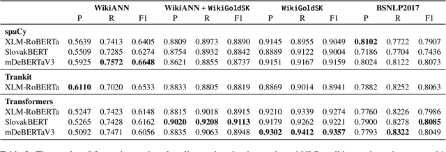Abstract:Named Entity Recognition (NER) is a fundamental NLP tasks with a wide range of practical applications. The performance of state-of-the-art NER methods depends on high quality manually anotated datasets which still do not exist for some languages. In this work we aim to remedy this situation in Slovak by introducing WikiGoldSK, the first sizable human labelled Slovak NER dataset. We benchmark it by evaluating state-of-the-art multilingual Pretrained Language Models and comparing it to the existing silver-standard Slovak NER dataset. We also conduct few-shot experiments and show that training on a sliver-standard dataset yields better results. To enable future work that can be based on Slovak NER, we release the dataset, code, as well as the trained models publicly under permissible licensing terms at https://github.com/NaiveNeuron/WikiGoldSK.