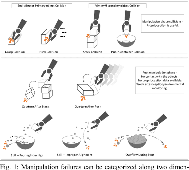 Abstract:An autonomous service robot should be able to interact with its environment safely and robustly without requiring human assistance. Unstructured environments are challenging for robots since the exact prediction of outcomes is not always possible. Even when the robot behaviors are well-designed, the unpredictable nature of physical robot-object interaction may prevent success in object manipulation. Therefore, execution of a manipulation action may result in an undesirable outcome involving accidents or damages to the objects or environment. Situation awareness becomes important in such cases to enable the robot to (i) maintain the integrity of both itself and the environment, (ii) recover from failed tasks in the short term, and (iii) learn to avoid failures in the long term. For this purpose, robot executions should be continuously monitored, and failures should be detected and classified appropriately. In this work, we focus on detecting and classifying both manipulation and post-manipulation phase failures using the same exteroception setup. We cover a diverse set of failure types for primary tabletop manipulation actions. In order to detect these failures, we propose FINO-Net [1], a deep multimodal sensor fusion based classifier network. Proposed network accurately detects and classifies failures from raw sensory data without any prior knowledge. In this work, we use our extended FAILURE dataset [1] with 99 new multimodal manipulation recordings and annotate them with their corresponding failure types. FINO-Net achieves 0.87 failure detection and 0.80 failure classification F1 scores. Experimental results show that proposed architecture is also appropriate for real-time use.