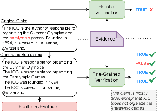 Abstract:Large Language Models (LLMs) have shown impressive capability in language generation and understanding, but their tendency to hallucinate and produce factually incorrect information remains a key limitation. To verify LLM-generated contents and claims from other sources, traditional verification approaches often rely on holistic models that assign a single factuality label to complex claims, potentially obscuring nuanced errors. In this paper, we advocate for a shift toward fine-grained verification, where complex claims are broken down into smaller sub-claims for individual verification, allowing for more precise identification of inaccuracies, improved transparency, and reduced ambiguity in evidence retrieval. However, generating sub-claims poses challenges, such as maintaining context and ensuring semantic equivalence with respect to the original claim. We introduce FactLens, a benchmark for evaluating fine-grained fact verification, with metrics and automated evaluators of sub-claim quality. The benchmark data is manually curated to ensure high-quality ground truth. Our results show alignment between automated FactLens evaluators and human judgments, and we discuss the impact of sub-claim characteristics on the overall verification performance.