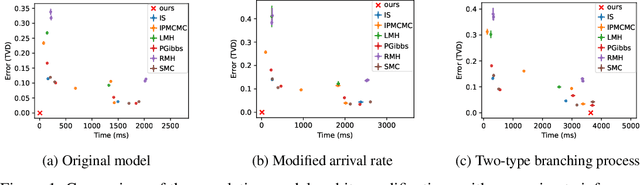 Abstract:A challenging problem in probabilistic programming is to develop inference algorithms that work for arbitrary programs in a universal probabilistic programming language (PPL). We present the nonparametric involutive Markov chain Monte Carlo (NP-iMCMC) algorithm as a method for constructing MCMC inference algorithms for nonparametric models expressible in universal PPLs. Building on the unifying involutive MCMC framework, and by providing a general procedure for driving state movement between dimensions, we show that NP-iMCMC can generalise numerous existing iMCMC algorithms to work on nonparametric models. We prove the correctness of the NP-iMCMC sampler. Our empirical study shows that the existing strengths of several iMCMC algorithms carry over to their nonparametric extensions. Applying our method to the recently proposed Nonparametric HMC, an instance of (Multiple Step) NP-iMCMC, we have constructed several nonparametric extensions (all of which new) that exhibit significant performance improvements.