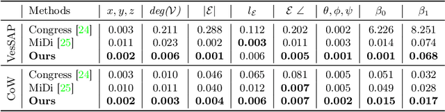 Abstract:Blood vessel networks, represented as 3D graphs, help predict disease biomarkers, simulate blood flow, and aid in synthetic image generation, relevant in both clinical and pre-clinical settings. However, generating realistic vessel graphs that correspond to an anatomy of interest is challenging. Previous methods aimed at generating vessel trees mostly in an autoregressive style and could not be applied to vessel graphs with cycles such as capillaries or specific anatomical structures such as the Circle of Willis. Addressing this gap, we introduce the first application of \textit{denoising diffusion models} in 3D vessel graph generation. Our contributions include a novel, two-stage generation method that sequentially denoises node coordinates and edges. We experiment with two real-world vessel datasets, consisting of microscopic capillaries and major cerebral vessels, and demonstrate the generalizability of our method for producing diverse, novel, and anatomically plausible vessel graphs.