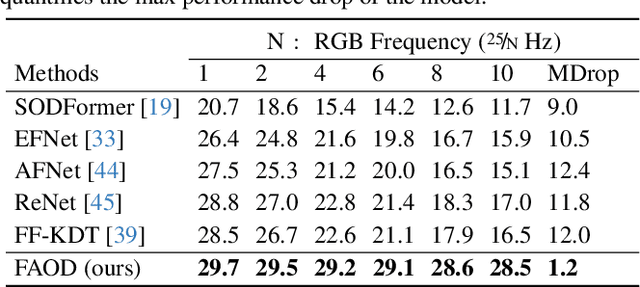 Abstract:Fusing Events and RGB images for object detection leverages the robustness of Event cameras in adverse environments and the rich semantic information provided by RGB cameras. However, two critical mismatches: low-latency Events \textit{vs.}~high-latency RGB frames; temporally sparse labels in training \textit{vs.}~continuous flow in inference, significantly hinder the high-frequency fusion-based object detection. To address these challenges, we propose the \textbf{F}requency-\textbf{A}daptive Low-Latency \textbf{O}bject \textbf{D}etector (FAOD). FAOD aligns low-frequency RGB frames with high-frequency Events through an Align Module, which reinforces cross-modal style and spatial proximity to address the Event-RGB Mismatch. We further propose a training strategy, Time Shift, which enforces the module to align the prediction from temporally shifted Event-RGB pairs and their original representation, that is, consistent with Event-aligned annotations. This strategy enables the network to use high-frequency Event data as the primary reference while treating low-frequency RGB images as supplementary information, retaining the low-latency nature of the Event stream toward high-frequency detection. Furthermore, we observe that these corrected Event-RGB pairs demonstrate better generalization from low training frequency to higher inference frequencies compared to using Event data alone. Extensive experiments on the PKU-DAVIS-SOD and DSEC-Detection datasets demonstrate that our FAOD achieves SOTA performance. Specifically, in the PKU-DAVIS-SOD Dataset, FAOD achieves 9.8 points improvement in terms of the mAP in fully paired Event-RGB data with only a quarter of the parameters compared to SODFormer, and even maintains robust performance (only a 3 points drop in mAP) under 80$\times$ Event-RGB frequency mismatch.