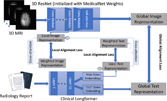 Abstract:Despite the promising performance of convolutional neural networks (CNNs) in brain tumor diagnosis from magnetic resonance imaging (MRI), their integration into the clinical workflow has been limited. That is mainly due to the fact that the features contributing to a model's prediction are unclear to radiologists and hence, clinically irrelevant, i.e., lack of explainability. As the invaluable sources of radiologists' knowledge and expertise, radiology reports can be integrated with MRI in a contrastive learning (CL) framework, enabling learning from image-report associations, to improve CNN explainability. In this work, we train a multimodal CL architecture on 3D brain MRI scans and radiology reports to learn informative MRI representations. Furthermore, we integrate tumor location, salient to several brain tumor analysis tasks, into this framework to improve its generalizability. We then apply the learnt image representations to improve explainability and performance of genetic marker classification of pediatric Low-grade Glioma, the most prevalent brain tumor in children, as a downstream task. Our results indicate a Dice score of 31.1% between the model's attention maps and manual tumor segmentation (as an explainability measure) with test classification performance of 87.7%, significantly outperforming the baselines. These enhancements can build trust in our model among radiologists, facilitating its integration into clinical practices for more efficient tumor diagnosis.