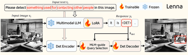 Abstract:With the fast-paced development of multimodal large language models (MLLMs), we can now converse with AI systems in natural languages to understand images. However, the reasoning power and world knowledge embedded in the large language models have been much less investigated and exploited for image perception tasks. In this paper, we propose Lenna, a language-enhanced reasoning detection assistant, which utilizes the robust multimodal feature representation of MLLMs, while preserving location information for detection. This is achieved by incorporating an additional <DET> token in the MLLM vocabulary that is free of explicit semantic context but serves as a prompt for the detector to identify the corresponding position. To evaluate the reasoning capability of Lenna, we construct a ReasonDet dataset to measure its performance on reasoning-based detection. Remarkably, Lenna demonstrates outstanding performance on ReasonDet and comes with significantly low training costs. It also incurs minimal transferring overhead when extended to other tasks. Our code and model will be available at https://git.io/Lenna.