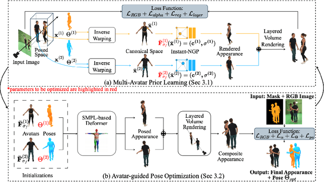 Abstract:Despite progress in human motion capture, existing multi-view methods often face challenges in estimating the 3D pose and shape of multiple closely interacting people. This difficulty arises from reliance on accurate 2D joint estimations, which are hard to obtain due to occlusions and body contact when people are in close interaction. To address this, we propose a novel method leveraging the personalized implicit neural avatar of each individual as a prior, which significantly improves the robustness and precision of this challenging pose estimation task. Concretely, the avatars are efficiently reconstructed via layered volume rendering from sparse multi-view videos. The reconstructed avatar prior allows for the direct optimization of 3D poses based on color and silhouette rendering loss, bypassing the issues associated with noisy 2D detections. To handle interpenetration, we propose a collision loss on the overlapping shape regions of avatars to add penetration constraints. Moreover, both 3D poses and avatars are optimized in an alternating manner. Our experimental results demonstrate state-of-the-art performance on several public datasets.