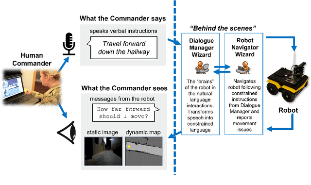 Abstract:ScoutBot is a dialogue interface to physical and simulated robots that supports collaborative exploration of environments. The demonstration will allow users to issue unconstrained spoken language commands to ScoutBot. ScoutBot will prompt for clarification if the user's instruction needs additional input. It is trained on human-robot dialogue collected from Wizard-of-Oz experiments, where robot responses were initiated by a human wizard in previous interactions. The demonstration will show a simulated ground robot (Clearpath Jackal) in a simulated environment supported by ROS (Robot Operating System).