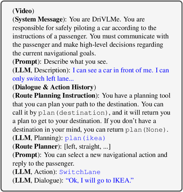 Abstract:Recent advancements in foundation models (FMs) have unlocked new prospects in autonomous driving, yet the experimental settings of these studies are preliminary, over-simplified, and fail to capture the complexity of real-world driving scenarios in human environments. It remains under-explored whether FM agents can handle long-horizon navigation tasks with free-from dialogue and deal with unexpected situations caused by environmental dynamics or task changes. To explore the capabilities and boundaries of FMs faced with the challenges above, we introduce DriVLMe, a video-language-model-based agent to facilitate natural and effective communication between humans and autonomous vehicles that perceive the environment and navigate. We develop DriVLMe from both embodied experiences in a simulated environment and social experiences from real human dialogue. While DriVLMe demonstrates competitive performance in both open-loop benchmarks and closed-loop human studies, we reveal several limitations and challenges, including unacceptable inference time, imbalanced training data, limited visual understanding, challenges with multi-turn interactions, simplified language generation from robotic experiences, and difficulties in handling on-the-fly unexpected situations like environmental dynamics and task changes.