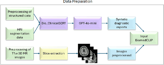 Abstract:The rapid advancements in Large Language Models (LLMs) and Vision-Language Models (VLMs) have shown great potential in medical diagnostics, particularly in radiology, where datasets such as X-rays are paired with human-generated diagnostic reports. However, a significant research gap exists in the neuroimaging field, especially for conditions such as Alzheimer's disease, due to the lack of comprehensive diagnostic reports that can be utilized for model fine-tuning. This paper addresses this gap by generating synthetic diagnostic reports using GPT-4o-mini on structured data from the OASIS-4 dataset, which comprises 663 patients. Using the synthetic reports as ground truth for training and validation, we then generated neurological reports directly from the images in the dataset leveraging the pre-trained BiomedCLIP and T5 models. Our proposed method achieved a BLEU-4 score of 0.1827, ROUGE-L score of 0.3719, and METEOR score of 0.4163, revealing its potential in generating clinically relevant and accurate diagnostic reports.