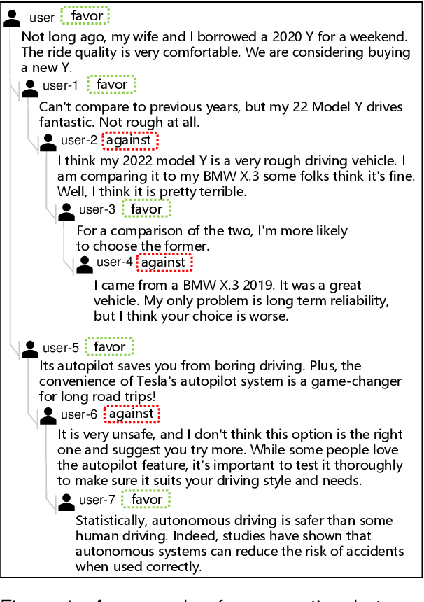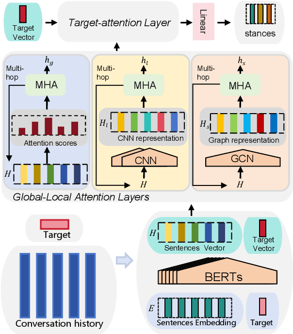 Abstract:Previous stance detection studies typically concentrate on evaluating stances within individual instances, thereby exhibiting limitations in effectively modeling multi-party discussions concerning the same specific topic, as naturally transpire in authentic social media interactions. This constraint arises primarily due to the scarcity of datasets that authentically replicate real social media contexts, hindering the research progress of conversational stance detection. In this paper, we introduce a new multi-turn conversation stance detection dataset (called \textbf{MT-CSD}), which encompasses multiple targets for conversational stance detection. To derive stances from this challenging dataset, we propose a global-local attention network (\textbf{GLAN}) to address both long and short-range dependencies inherent in conversational data. Notably, even state-of-the-art stance detection methods, exemplified by GLAN, exhibit an accuracy of only 50.47\%, highlighting the persistent challenges in conversational stance detection. Furthermore, our MT-CSD dataset serves as a valuable resource to catalyze advancements in cross-domain stance detection, where a classifier is adapted from a different yet related target. We believe that MT-CSD will contribute to advancing real-world applications of stance detection research. Our source code, data, and models are available at \url{https://github.com/nfq729/MT-CSD}.