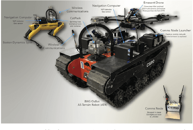 Abstract:Heterogeneous teams of robots, leveraging a balance between autonomy and human interaction, bring powerful capabilities to the problem of exploring dangerous, unstructured subterranean environments. Here we describe the solution developed by Team CSIRO Data61, consisting of CSIRO, Emesent and Georgia Tech, during the DARPA Subterranean Challenge. These presented systems were fielded in the Tunnel Circuit in August 2019, the Urban Circuit in February 2020, and in our own Cave event, conducted in September 2020. A unique capability of the fielded team is the homogeneous sensing of the platforms utilised, which is leveraged to obtain a decentralised multi-agent SLAM solution on each platform (both ground agents and UAVs) using peer-to-peer communications. This enabled a shift in focus from constructing a pervasive communications network to relying on multi-agent autonomy, motivated by experiences in early circuit events. These experiences also showed the surprising capability of rugged tracked platforms for challenging terrain, which in turn led to the heterogeneous team structure based on a BIA5 OzBot Titan ground robot and an Emesent Hovermap UAV, supplemented by smaller tracked or legged ground robots. The ground agents use a common CatPack perception module, which allowed reuse of the perception and autonomy stack across all ground agents with minimal adaptation.