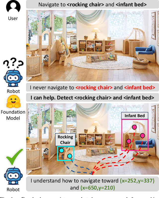 Abstract:Zero-shot object navigation is a challenging task for home-assistance robots. This task emphasizes visual grounding, commonsense inference and locomotion abilities, where the first two are inherent in foundation models. But for the locomotion part, most works still depend on map-based planning approaches. The gap between RGB space and map space makes it difficult to directly transfer the knowledge from foundation models to navigation tasks. In this work, we propose a Pixel-guided Navigation skill (PixNav), which bridges the gap between the foundation models and the embodied navigation task. It is straightforward for recent foundation models to indicate an object by pixels, and with pixels as the goal specification, our method becomes a versatile navigation policy towards all different kinds of objects. Besides, our PixNav is a pure RGB-based policy that can reduce the cost of home-assistance robots. Experiments demonstrate the robustness of the PixNav which achieves 80+% success rate in the local path-planning task. To perform long-horizon object navigation, we design an LLM-based planner to utilize the commonsense knowledge between objects and rooms to select the best waypoint. Evaluations across both photorealistic indoor simulators and real-world environments validate the effectiveness of our proposed navigation strategy. Code and video demos are available at https://github.com/wzcai99/Pixel-Navigator.
