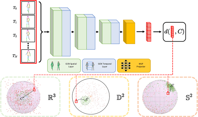 Abstract:Detecting the anomaly of human behavior is paramount to timely recognizing endangering situations, such as street fights or elderly falls. However, anomaly detection is complex, since anomalous events are rare and because it is an open set recognition task, i.e., what is anomalous at inference has not been observed at training. We propose COSKAD, a novel model which encodes skeletal human motion by an efficient graph convolutional network and learns to COntract SKeletal kinematic embeddings onto a latent hypersphere of minimum volume for Anomaly Detection. We propose and analyze three latent space designs for COSKAD: the commonly-adopted Euclidean, and the new spherical-radial and hyperbolic volumes. All three variants outperform the state-of-the-art, including video-based techniques, on the ShangaiTechCampus, the Avenue, and on the most recent UBnormal dataset, for which we contribute novel skeleton annotations and the selection of human-related videos. The source code and dataset will be released upon acceptance.