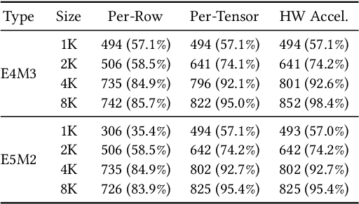 Abstract:The introduction of 8-bit floating-point (FP8) computation units in modern AI accelerators has generated significant interest in FP8-based large language model (LLM) inference. Unlike 16-bit floating-point formats, FP8 in deep learning requires a shared scaling factor. Additionally, while E4M3 and E5M2 are well-defined at the individual value level, their scaling and accumulation methods remain unspecified and vary across hardware and software implementations. As a result, FP8 behaves more like a quantization format than a standard numeric representation. In this work, we provide the first comprehensive analysis of FP8 computation and acceleration on two AI accelerators: the NVIDIA H100 and Intel Gaudi 2. Our findings highlight that the Gaudi 2, by leveraging FP8, achieves higher throughput-to-power efficiency during LLM inference, offering valuable insights into the practical implications of FP8 adoption for datacenter-scale LLM serving.