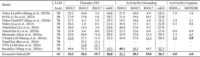 Abstract:Video Large Language Models (Video-LLMs) have demonstrated remarkable capabilities in coarse-grained video understanding, however, they struggle with fine-grained temporal grounding. In this paper, we introduce Grounded-VideoLLM, a novel Video-LLM adept at perceiving and reasoning over specific video moments in a fine-grained manner. We identify that current Video-LLMs have limitations for fine-grained video understanding since they lack effective temporal modeling and timestamp representation. In light of this, we sharpen our model by incorporating (1) an additional temporal stream to encode the relationships between frames and (2) discrete temporal tokens enriched with specific time knowledge to represent timestamps. To optimize the training of Grounded-VideoLLM, we employ a multi-stage training scheme, beginning with simple video-captioning tasks and progressively introducing video temporal grounding tasks of increasing complexity. To further enhance Grounded-VideoLLM's temporal reasoning capability, we also curate a grounded VideoQA dataset by an automatic annotation pipeline. Extensive experiments demonstrate that Grounded-VideoLLM not only excels in fine-grained grounding tasks such as temporal sentence grounding, dense video captioning, and grounded VideoQA, but also shows great potential as a versatile video assistant for general video understanding.