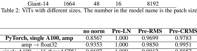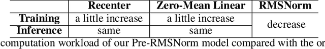 Abstract:Transformers have achieved great success in machine learning applications. Normalization techniques, such as Layer Normalization (LayerNorm, LN) and Root Mean Square Normalization (RMSNorm), play a critical role in accelerating and stabilizing the training of Transformers. While LayerNorm recenters and rescales input vectors, RMSNorm only rescales the vectors by their RMS value. Despite being more computationally efficient, RMSNorm may compromise the representation ability of Transformers. There is currently no consensus regarding the preferred normalization technique, as some models employ LayerNorm while others utilize RMSNorm, especially in recent large language models. It is challenging to convert Transformers with one normalization to the other type. While there is an ongoing disagreement between the two normalization types, we propose a solution to unify two mainstream Transformer architectures, Pre-LN and Pre-RMSNorm Transformers. By removing the inherent redundant mean information in the main branch of Pre-LN Transformers, we can reduce LayerNorm to RMSNorm, achieving higher efficiency. We further propose the Compressed RMSNorm (CRMSNorm) and Pre-CRMSNorm Transformer based on a lossless compression of the zero-mean vectors. We formally establish the equivalence of Pre-LN, Pre-RMSNorm, and Pre-CRMSNorm Transformer variants in both training and inference. It implies that Pre-LN Transformers can be substituted with Pre-(C)RMSNorm counterparts at almost no cost, offering the same arithmetic functionality along with free efficiency improvement. Experiments demonstrate that we can reduce the training and inference time of Pre-LN Transformers by up to 10%.