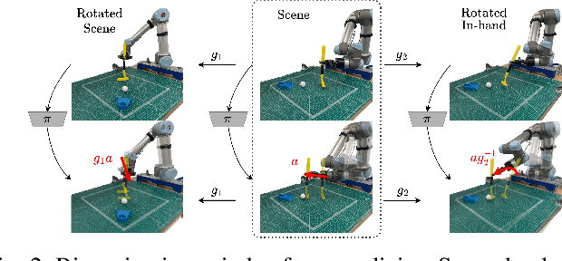 Abstract:Equivariant models have recently been shown to improve the data efficiency of diffusion policy by a significant margin. However, prior work that explored this direction focused primarily on point cloud inputs generated by multiple cameras fixed in the workspace. This type of point cloud input is not compatible with the now-common setting where the primary input modality is an eye-in-hand RGB camera like a GoPro. This paper closes this gap by incorporating into the diffusion policy model a process that projects features from the 2D RGB camera image onto a sphere. This enables us to reason about symmetries in SO(3) without explicitly reconstructing a point cloud. We perform extensive experiments in both simulation and the real world that demonstrate that our method consistently outperforms strong baselines in terms of both performance and sample efficiency. Our work is the first SO(3)-equivariant policy learning framework for robotic manipulation that works using only monocular RGB inputs.