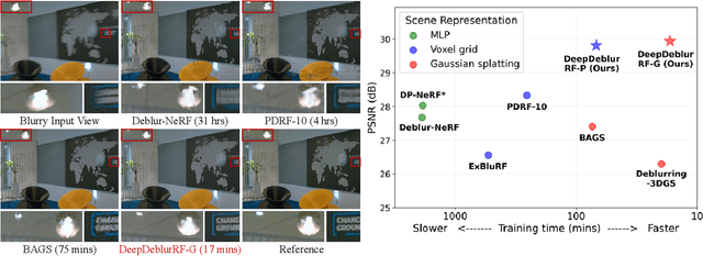 Abstract:In this paper, we propose DeepDeblurRF, a novel radiance field deblurring approach that can synthesize high-quality novel views from blurred training views with significantly reduced training time. DeepDeblurRF leverages deep neural network (DNN)-based deblurring modules to enjoy their deblurring performance and computational efficiency. To effectively combine DNN-based deblurring and radiance field construction, we propose a novel radiance field (RF)-guided deblurring and an iterative framework that performs RF-guided deblurring and radiance field construction in an alternating manner. Moreover, DeepDeblurRF is compatible with various scene representations, such as voxel grids and 3D Gaussians, expanding its applicability. We also present BlurRF-Synth, the first large-scale synthetic dataset for training radiance field deblurring frameworks. We conduct extensive experiments on both camera motion blur and defocus blur, demonstrating that DeepDeblurRF achieves state-of-the-art novel-view synthesis quality with significantly reduced training time.