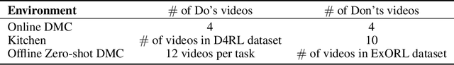 Abstract:Unsupervised skill discovery is a learning paradigm that aims to acquire diverse behaviors without explicit rewards. However, it faces challenges in learning complex behaviors and often leads to learning unsafe or undesirable behaviors. For instance, in various continuous control tasks, current unsupervised skill discovery methods succeed in learning basic locomotions like standing but struggle with learning more complex movements such as walking and running. Moreover, they may acquire unsafe behaviors like tripping and rolling or navigate to undesirable locations such as pitfalls or hazardous areas. In response, we present DoDont (Do's and Don'ts), an instruction-based skill discovery algorithm composed of two stages. First, in an instruction learning stage, DoDont leverages action-free instruction videos to train an instruction network to distinguish desirable transitions from undesirable ones. Then, in the skill learning stage, the instruction network adjusts the reward function of the skill discovery algorithm to weight the desired behaviors. Specifically, we integrate the instruction network into a distance-maximizing skill discovery algorithm, where the instruction network serves as the distance function. Empirically, with less than 8 instruction videos, DoDont effectively learns desirable behaviors and avoids undesirable ones across complex continuous control tasks. Code and videos are available at https://mynsng.github.io/dodont/